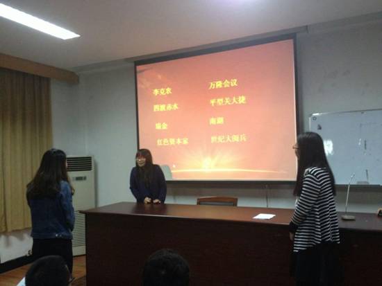 接下来,比赛正式开始。本次知识竞赛共分三关。第一关:狭路相逢。由选手随机挑选一位我党历史上或现实中人物,题库随机给出八个关键词,答题者要在三分钟内回答出这八个词,本关六进三。第二关:互动搭配。由晋级选手选择一位搭档,根据大屏幕上出现的与党有关的关键词一方描述,另一方做答,限时三分钟,答对多者晋级,本关三进二。第三关:谁与争锋。本关为抢答题,率先答对11个,且超对方2个的获的冠军。由于选手准备充分,搭档配合默契,整个比赛趣味横生,赢得了大家的一致喝彩。经过层层角逐,最终由国际商务党支部的华甜获得“冠军”,联合党支部的余璇获得“亚军”,金融学党支部的胡敏杰获得“季军”。