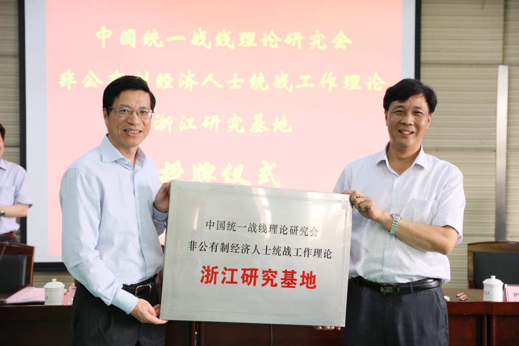 中央统战部研究室副主任章建敏宣读《麻豆传媒视频同意中国统一战线理论研究会非公有制经济人士统战工作理论浙江研究基地设在宁波大学的批复》。中央统战部研究室主任张健为基地授牌。