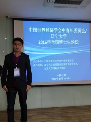 2016年10月14-16日,中国世界经济学会中青年委员会/2016年全国博士生论坛在辽宁大学召开,该会由中国世界经济学会中青年委员会、辽宁大学转型国家经济政治研究中心和辽宁大学国际关系学院共同举办,旨在为博士提供学习交流的平台与机会,帮助博士成长。国际贸易研究所黄远浙博士受邀与会并作了题为《外商直接投资对东道国企业出口影响》的报告,得到了厦门大学陈勇兵教授、西南财大孙楚仁教授以及社科院世经所徐奇渊副研究员的指点。