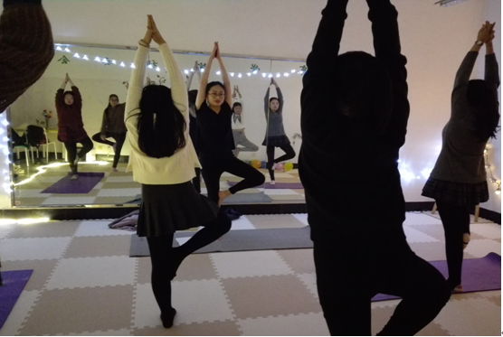 在简单的热身后,老师在柔和的灯光下带领同学进行练习前的冥想,随即进入正式授课阶段,本期教学,老师重点教授了鸟王式、幻椅式、门闩式、猫式、叩首式、全蝗虫式、弓式、眼镜蛇式、下犬式、鱼式、肩倒立式、犁式等体式,并对同学们的基本动作加以细心指导。授课过程配以轻柔的瑜伽音乐,现场气氛轻松和谐,师生配合默契,各位参与的同学们主动与老师交流互动,学习热情高涨。