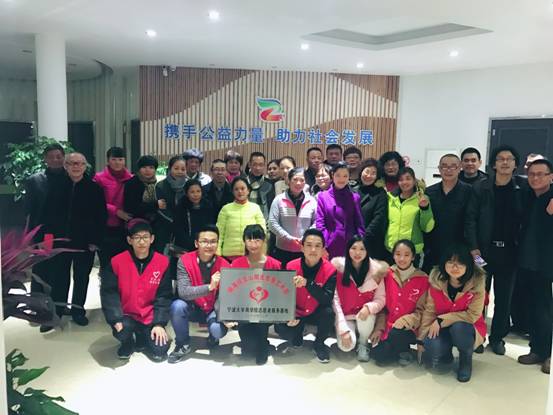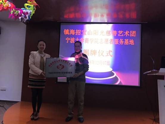 与镇海招宝山阳光慈善艺术团共建的青年志愿服务基地揭牌仪式在镇海社会组织公益服务中心顺利举行。学工办主任董璐、阳光慈善艺术团团长张海江为志愿服务基地揭牌。