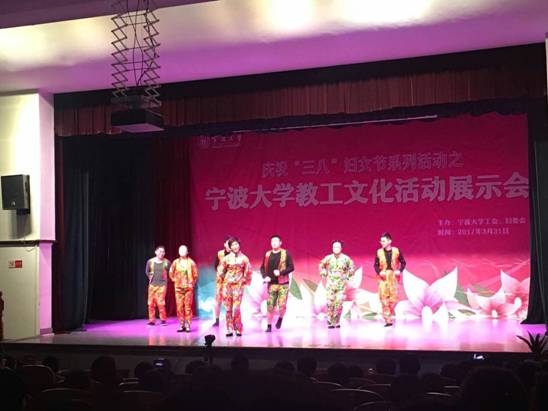 3月31日,为庆祝“三·八”妇女节,校工会在锦绣小剧场举行别开生面的“宁波大学教工文化展示”活动。国产麻豆视频 分工会组织卲丽、董璐、汪杰峰、陈彬、毛跃祖、蒋鹏涛、张晓婳、袁丹丹、陈文鹤等九位老师积极参与学校工会活动。9位老师利用业余时间,积极排练,组织编排的节目“屯里的天气预报”获得现场观众一致好评。