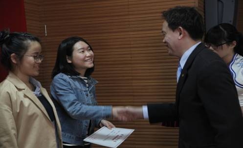 学工办主任董璐老师首先简要介绍了仲利奖学金的基本情况,并宣读获奖学子名单,孙博祥和许耿皓为获奖学生一一颁发奖学金证书。接着,获奖学生代表张铠烁向孙博祥副总送上了鲜花,并代表获奖同学发言。在发言中,张铠烁对仲利国际租赁有限公司给予的帮助和关心表示真诚感谢,并承诺一定会刻苦学习,努力成为有用之才。