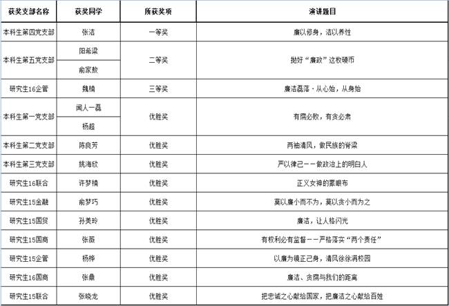 经过激烈的角逐,本科生第四党支部张洁凭借优异的表现荣获一等奖;本科生第五党支部阳希梁、俞家敖获得二等奖;研究生16企业管理党支部魏楠获得三等奖,其他11名参赛选手获得优胜奖。本次演讲比赛在颁奖及合影中圆满落下帷幕!
