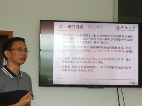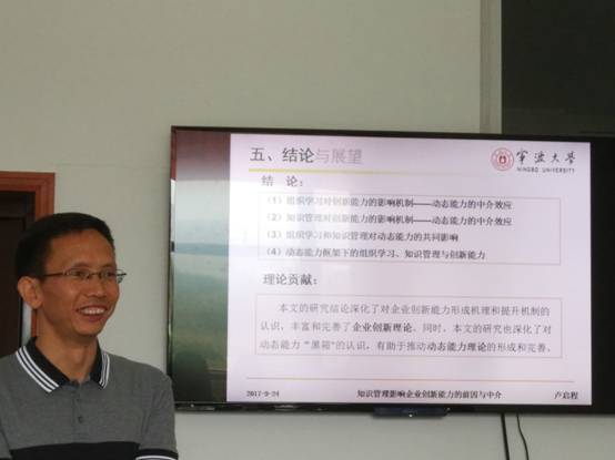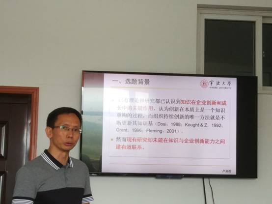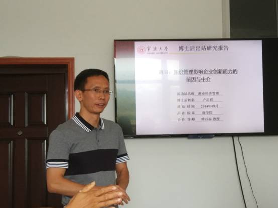 2017年9月24日上午10点,宁波大学渔业经济与管理博士后流动站卢启程博士后出站报告研讨会在11号楼103-2会议室举行。报告主题为“知识管理影响企业创新能力的前因与中介”,报告会由教育部特聘教授钟昌标教授主持,邀请了中国人民大学等校专家参与研讨,麻豆传媒视频-国产麻豆影片-国产麻豆视频